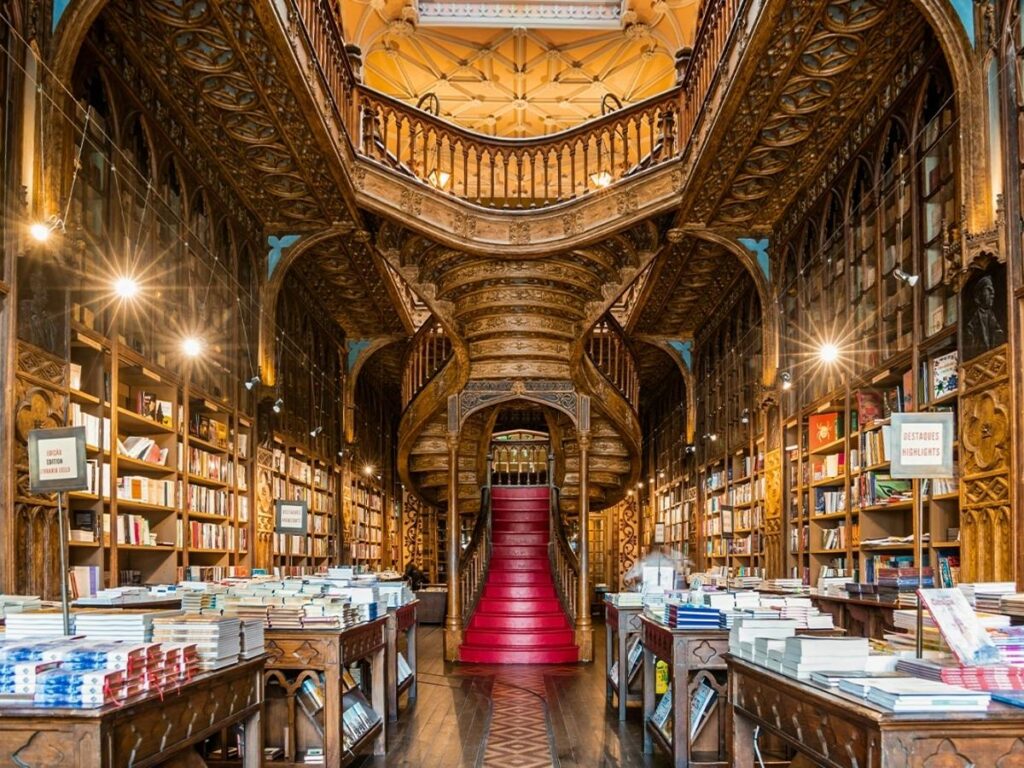 Livraria Lello in Porto, Portugal, inspired elements of the Harry Potter series. J.K. Rowling lived in Porto while writing the first book and frequented this bookstore, which influenced Hogwarts’ design.
